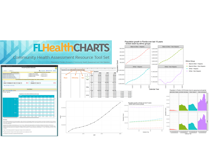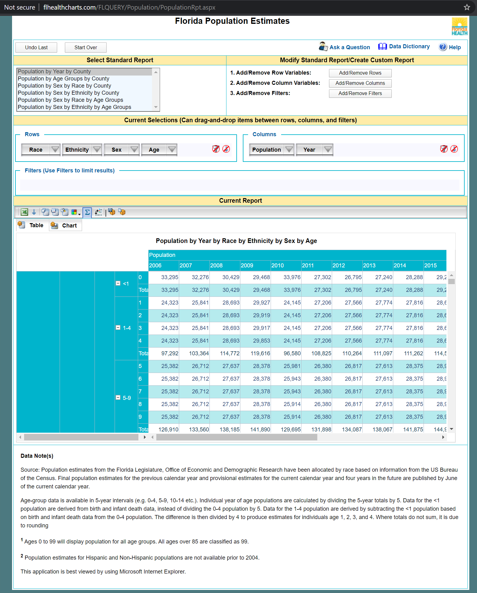 The initial extract of the data was obtained from www.flhealthcharts.com, a reporting tool for population counts estimated by the Florida Department of Health. The figure below shows the modifications to the default query the produces the data product used in this demonstration: