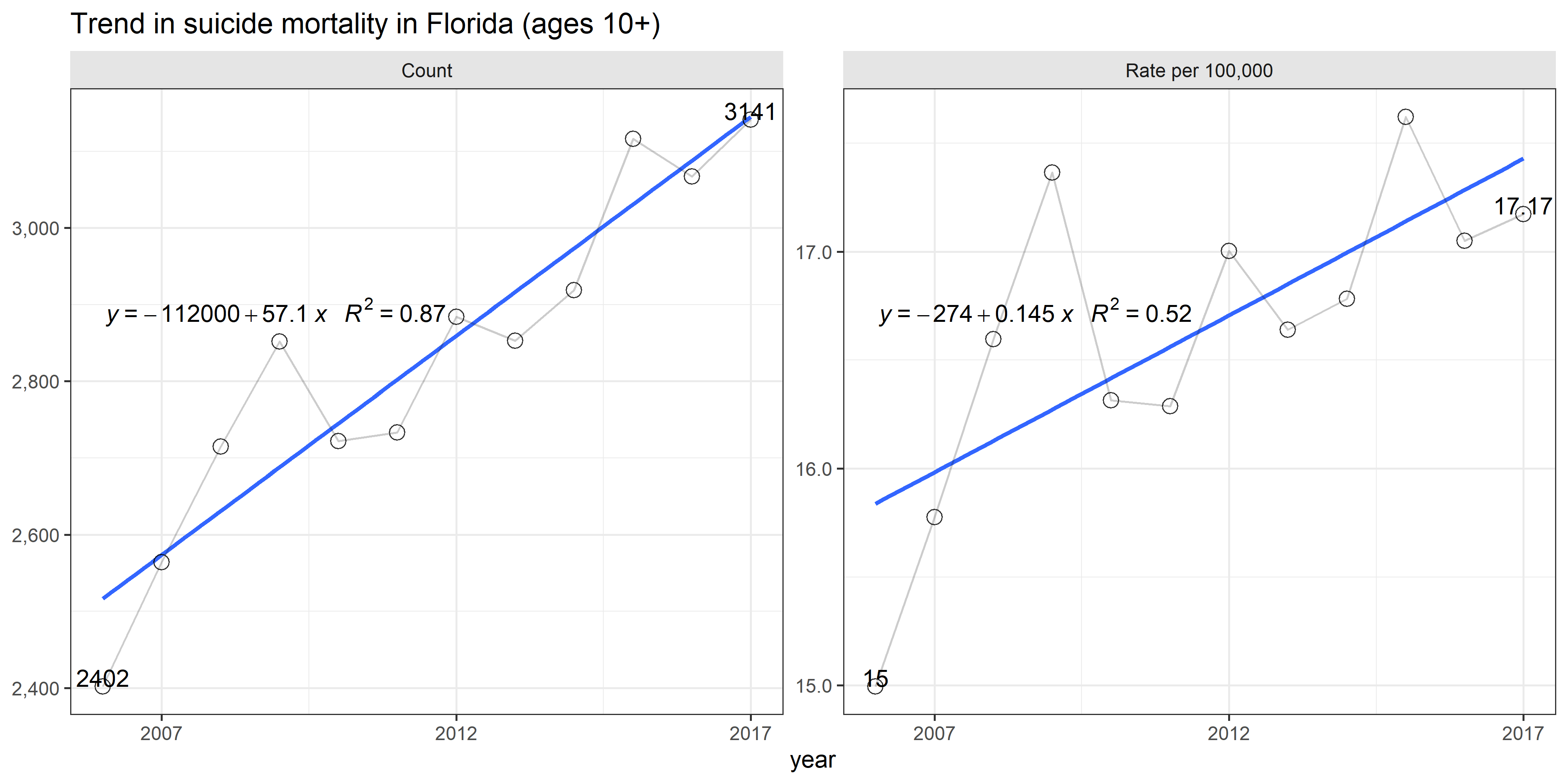 Similar to national trends, the rates of suicide in Florida has been on the rise since 2006. In 2006, the Department of Health registered 2,402 suicides, while in 2017 this number reached 3,141. On average, each year the total number of suicides in Florida increased by 57 during this time. While the rising number of suicides events could be partially explained by demographic growth (see full report for details ), when adjusted for population size the rate per 100,000 still indicated that suicides became more prevalent: the rate increased from 15 in 2006 to 17.2 per 100,000 in 2017, averaging .15 in annual growth.