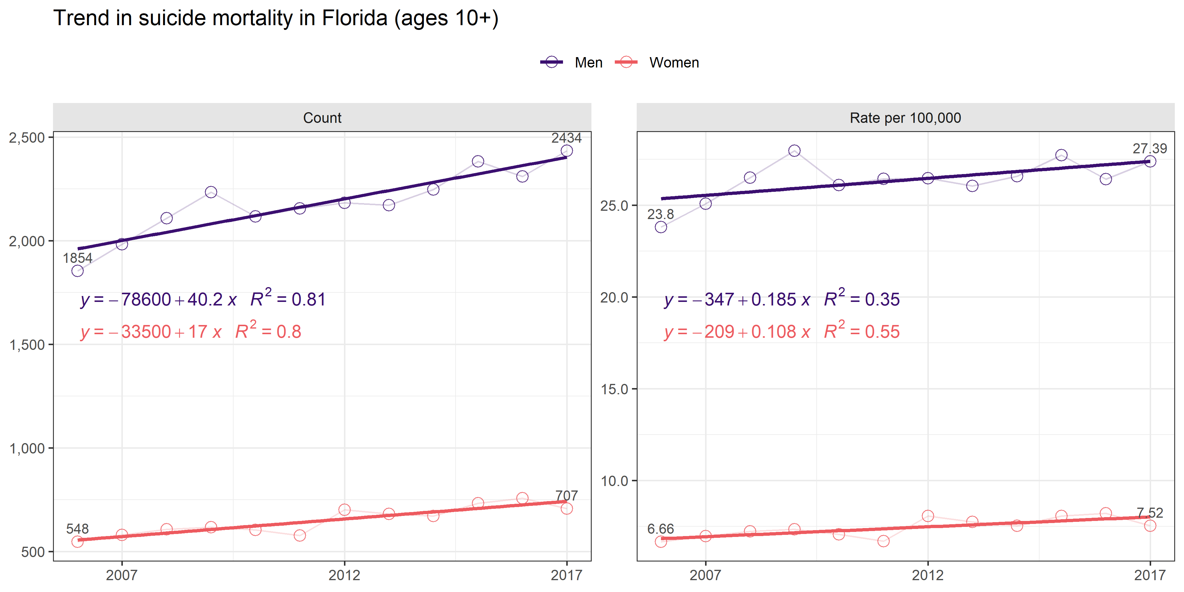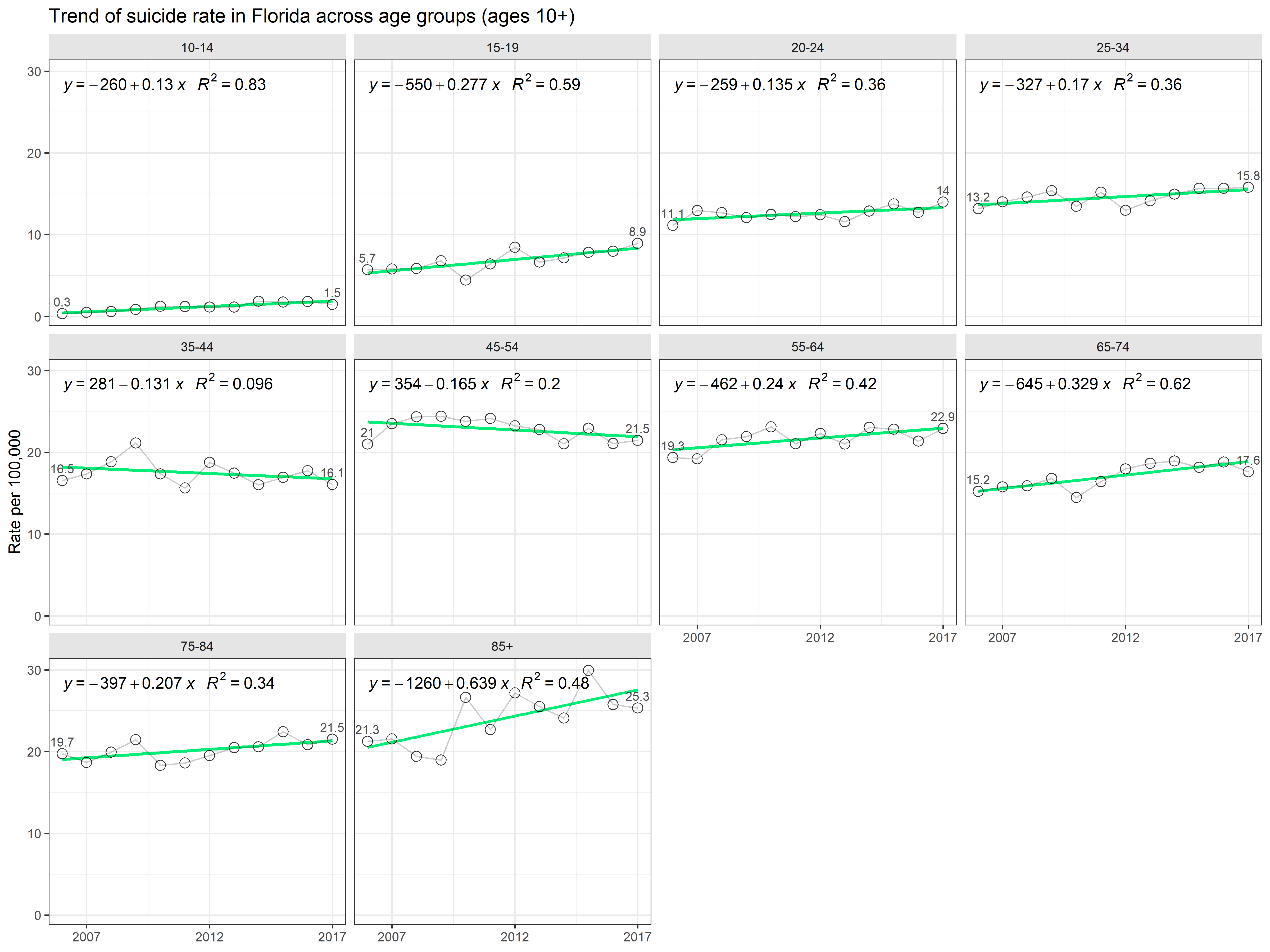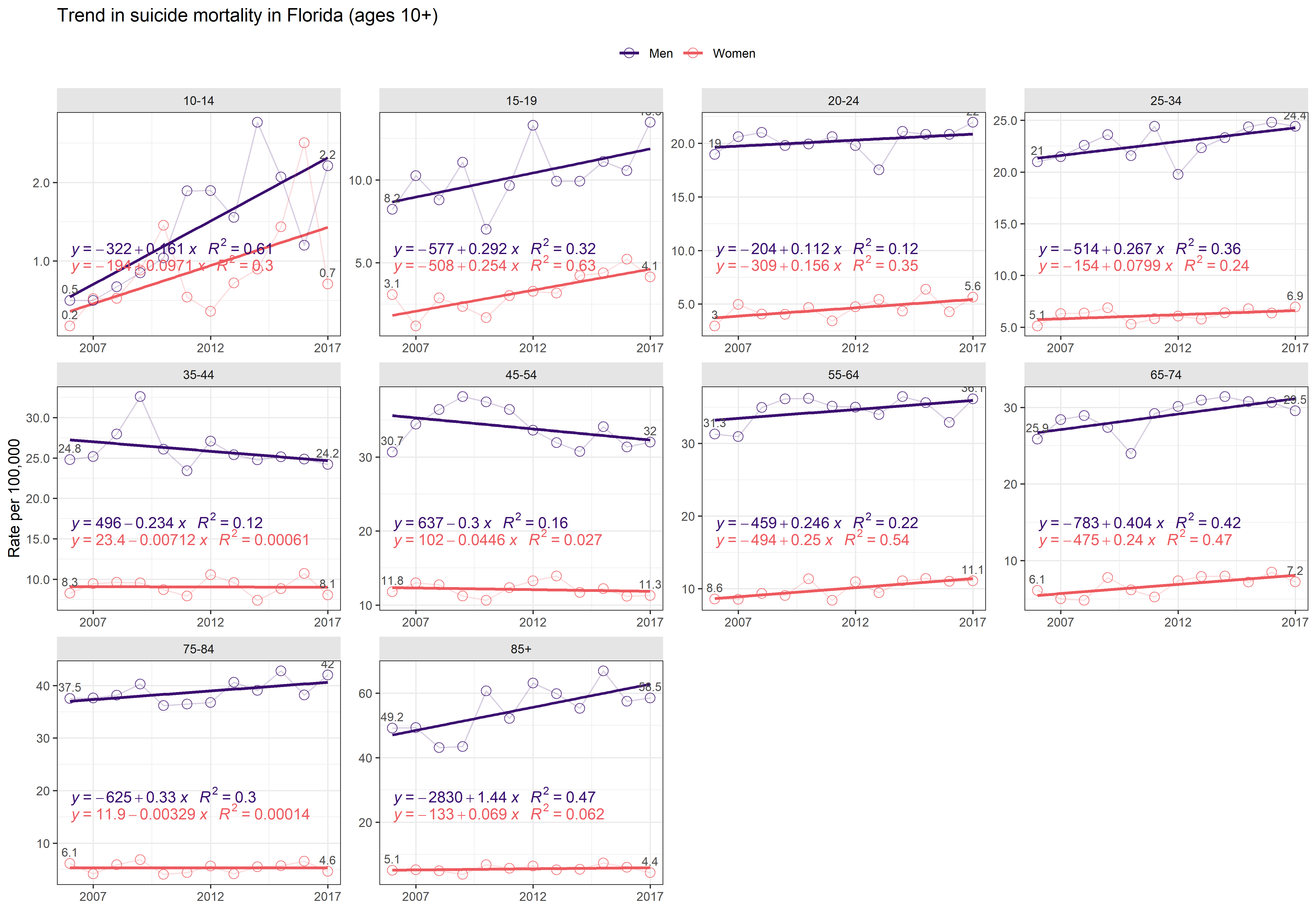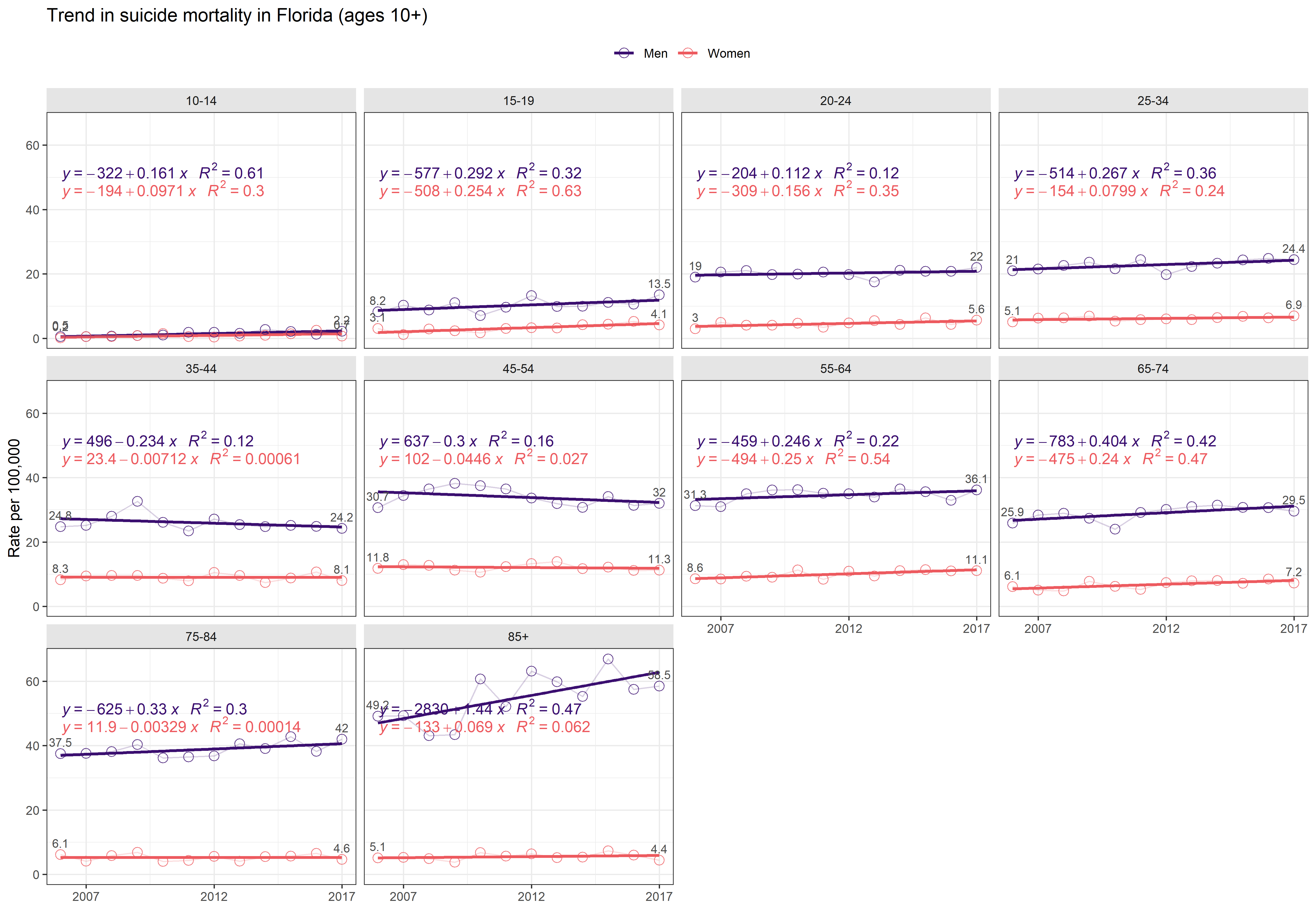 The top view helps comparing the overal level of suicide rates among age groups, accounting for sex differences. We see that the highest rates are among the oldest Floridians: 75-84 and 85+ groups, the latter exhibiting the fastest growth rate of 1.44 per year, rising by almost 20% from 49.2 per 100,000 in 2006 to 58.5 in 2017.