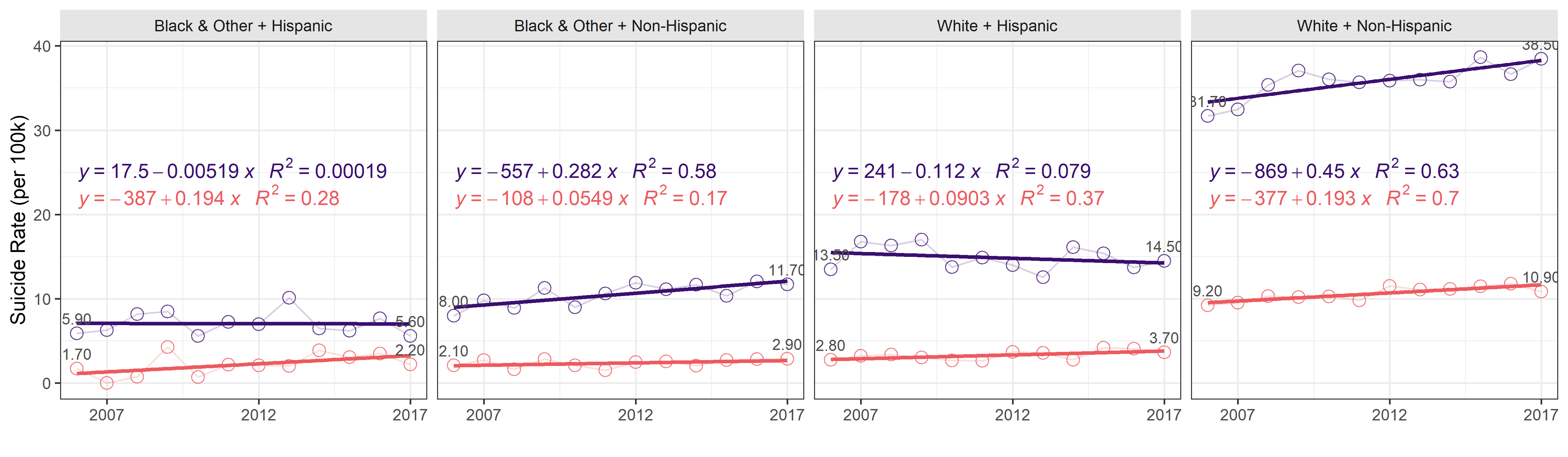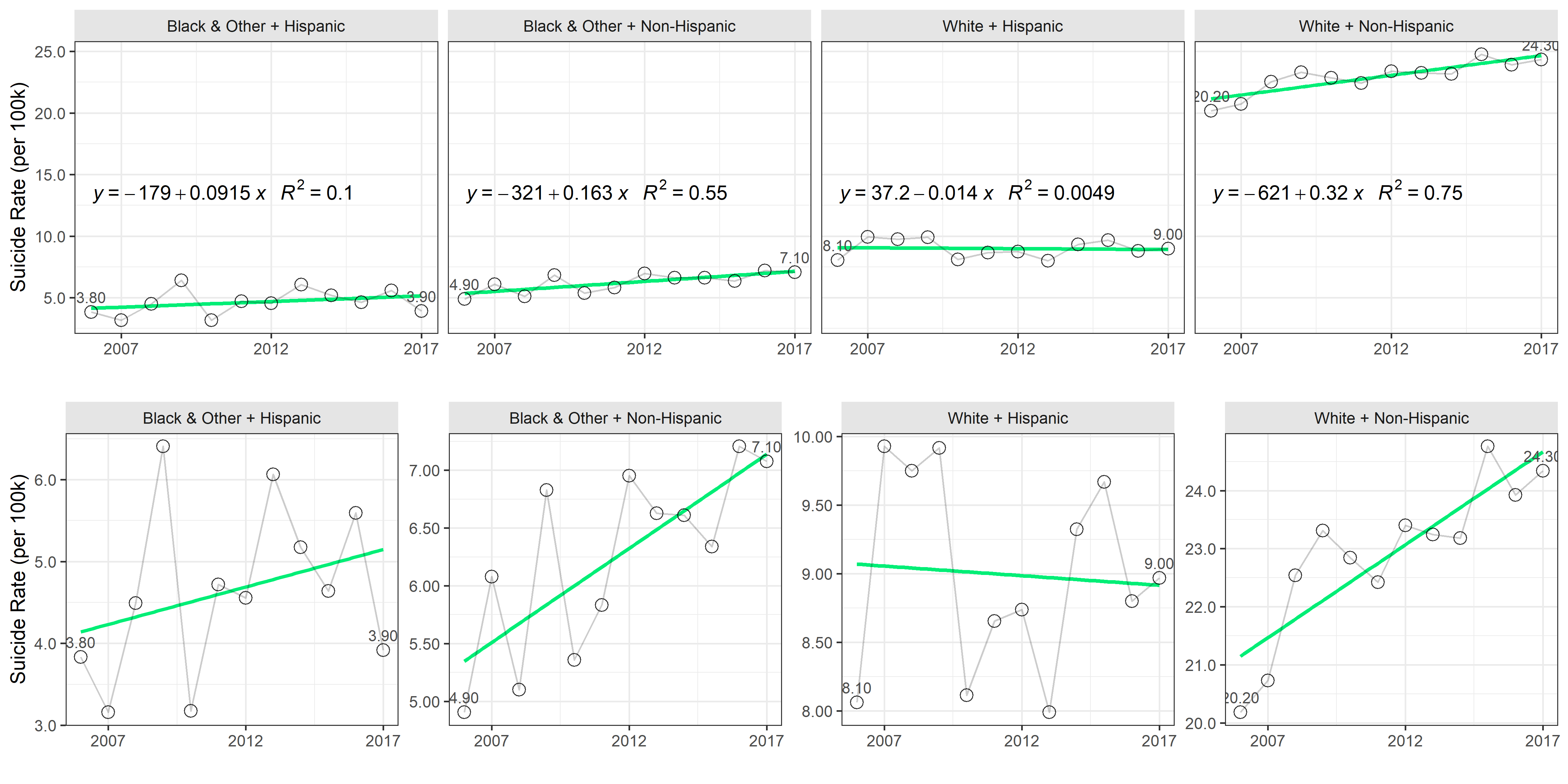 White Non-Hispanics exhibit the highest suicide rate and also the steepest growth of .32 suicides per 100,000 per year. The top row of the graph places the trends on the same scale, while the bottom row displays them on individual scale. Note, however, that annual fluctuations are less meaningful for less populous ethnic groups, such as Black & Other + Hispanic