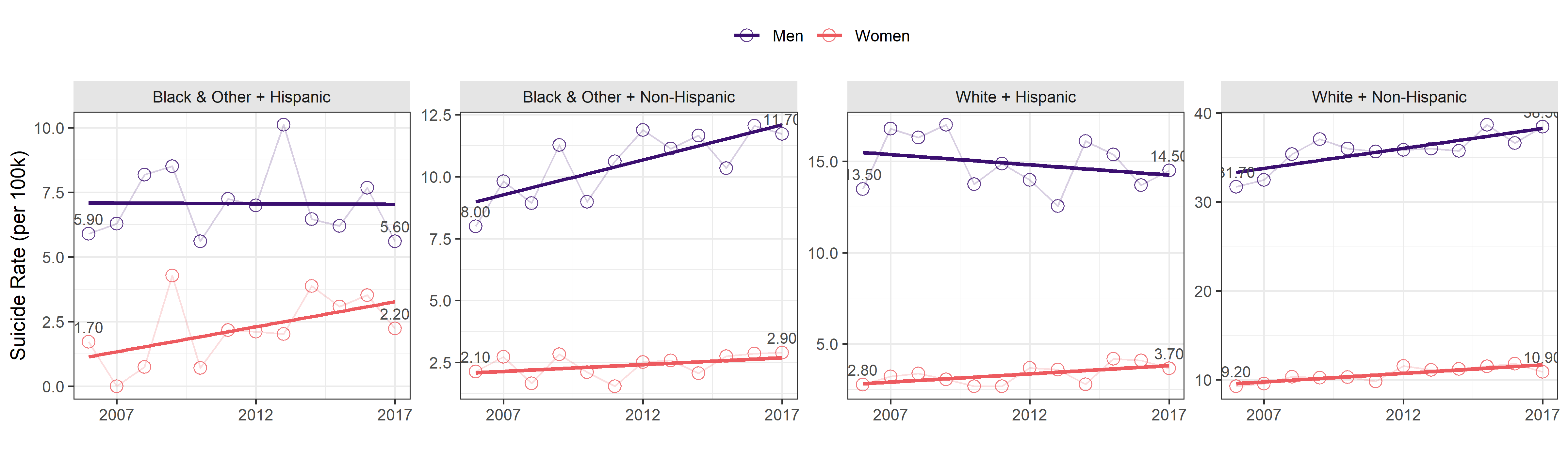 Replotting with free y-axis helps us see that growth in suicide rate among men is not universal across ethnic groups. Suicide rate is actually decreasing among non-white men with Hispanic origin.