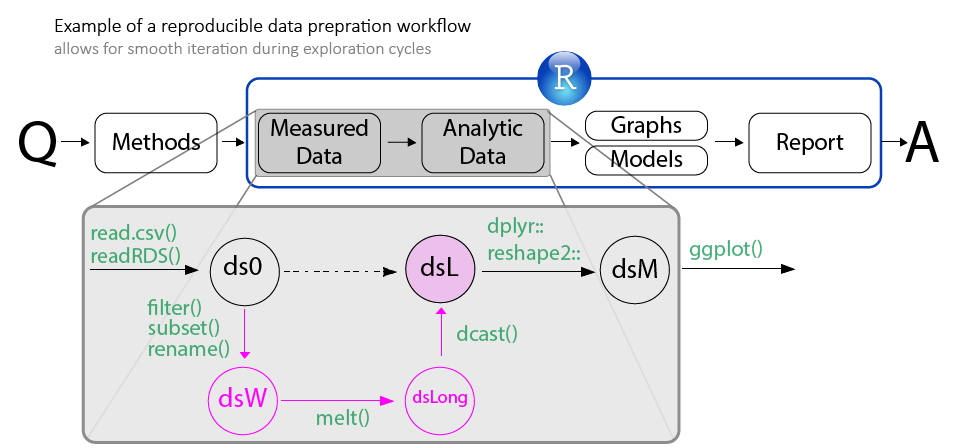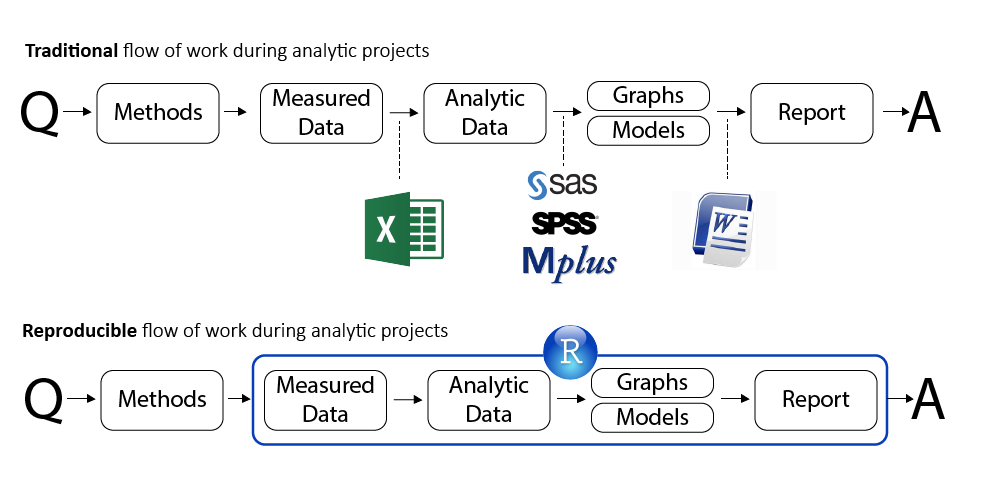 The lecture introduces reproducible research and demonstrates digital self-publishing with RStudio and Git (Hub). The skills described and emphasized in this workflow include data manipulation, graph production, statistical modeling, and dynamic reporting. A series of four talks discusses each skill and gives examples of possible implementations in R.
